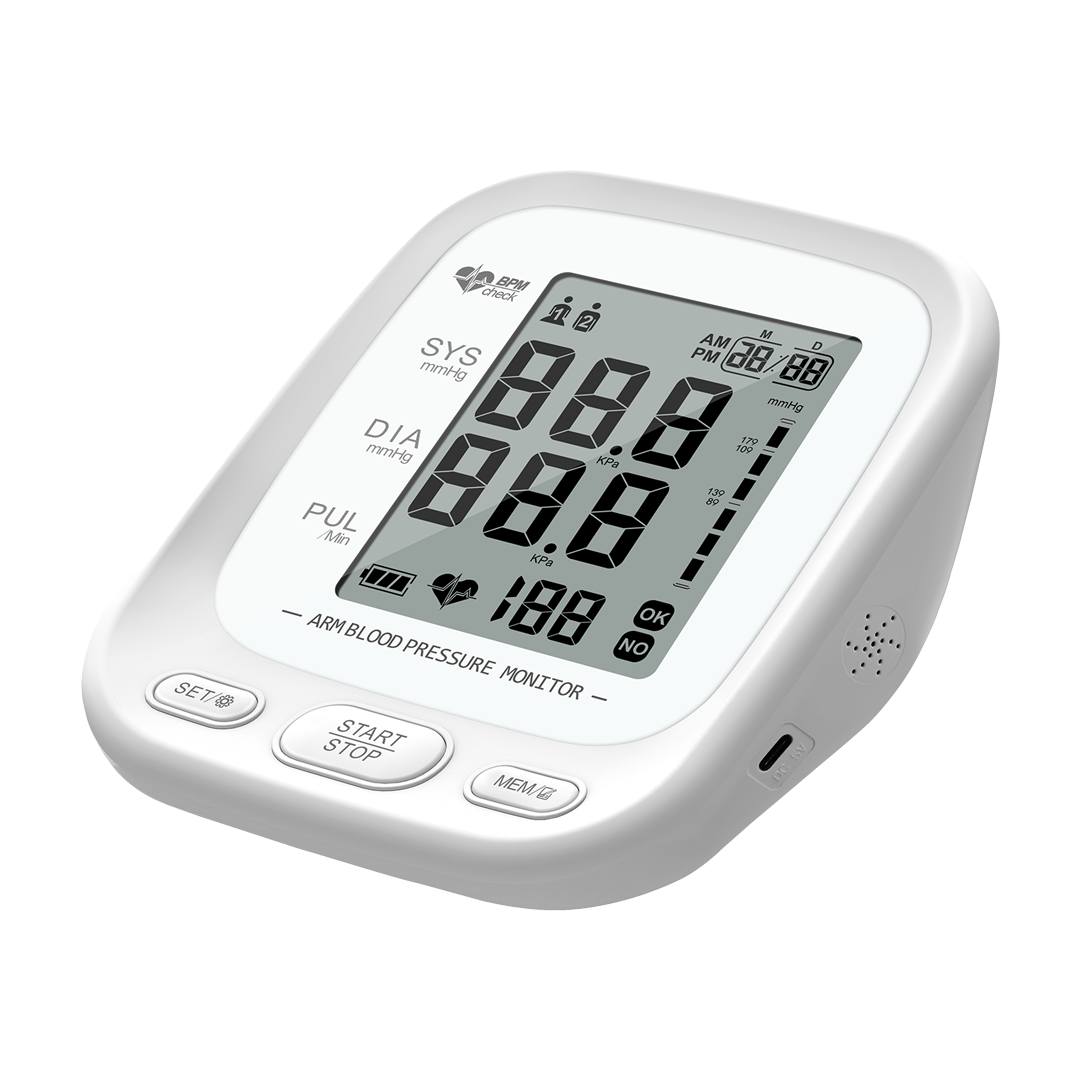 The arterial blood pressure monitor measures systolic and diastolic blood pressure and pulse rate in adults using a non-invasive oscillometric technique with an inflatable cuff.